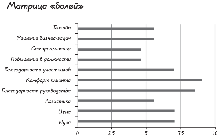 В общении с клиентом ищите то, в чем заключается его главная боль, – его основную потребность, источник переживаний и волнений. Попытайтесь понять, что клиент хочет получить от мероприятия на самом деле: спокойствие, ощущение собственного превосходства, оптимизацию бюджета и экономию средств, творческую реализацию, общение и возможность завести новых друзей и т. д. Выясните, какой из аспектов реализации проекта он считает ключевым: смету, логистику и навигацию на площадке, кейтеринг, welcome-зону, яркую шоу-программу с известными артистами, общую концепцию или что-то еще.