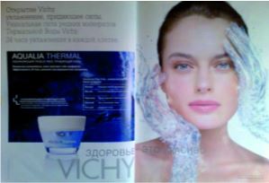В визуальном ряде данного рекламного сообщения мы видим лицо молодой девушки с ровной, красивой, ухоженной кожей, о которой заботится увлажняющий крем Vichy с термальной водой, представленный в данном случае в виде заботливых рук, помогающих коже получить необходимую влагу и придать ей упругость и свежесть. Прием визуальной метафоры позволяет адресату зримо представить функциональные характеристики рекламируемого продукта и вызывает желание испытать подобные ощущения от использования этого крема. Что касается вербальной составляющей, то в основном рекламном тексте (ОРТ) представлен компонентный состав крема Vichy с использованием терминологической лексики. Слоган «Здоровье – это красиво» тоже употреблен в прямом значении.