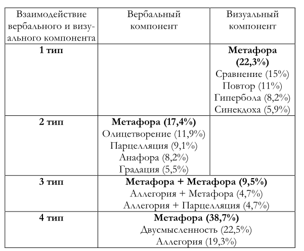 Что касается взаимодействия риторических фигур на вербальном и визуальном уровнях, то нами было выделено несколько типов взаимодействия в зависимости от специфики использования в них риторических фигур: