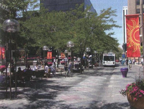 Рис. 6.3. Transit malls (пешеходные зоны с движением общественного транспорта) наподобие Стейт-стрит в г. Мэдисон, США — замечательные общественные пространства. Они прекрасно подходят для проведения городских мероприятий, например фермерских рынков, фестивалей и других, где автомобили нежелательны (в данном случае шоу ретроавтомобилей — вполне желанный гость.)