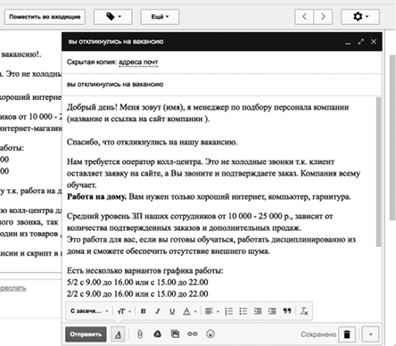 Что я имею в виду? Например, вам нужно найти менеджера по продажам. Вы размещаете вакансию на всех необходимых площадках, далее к вам поступают от кандидатов либо отклики, либо вопросы в соцсети. Очень рекомендую не тратить время для точечного общения с кандидатами. Нужно собрать адреса электронной почты, затем массовой рассылкой пригласить кандидатов на индивидуальное собеседование. Составьте типовое письмо для рассылки и направьте его всем через функцию «скрытая копия».