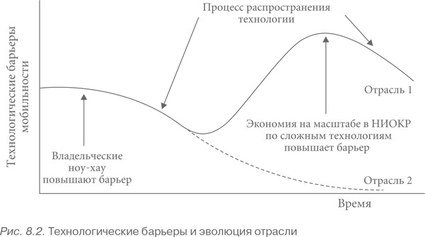 Рисунок 8.2 иллюстрирует две из многих возможных моделей динамики барьеров мобильности, основанных на исключительном владении технологией. В обеих отраслях, представленных на схеме, экономия на масштабе в сфере НИОКР сначала была на низком уровне, поскольку исходные инновации, направленные на прорыв, создавались небольшими группами специалистов. Такая ситуация довольно обычна, она встречалась в таких отраслях, как производство полупроводников, мини-компьютеров и др. В подобных отраслях собственническая технология создала довольно скромный начальный барьер мобильности, который вскоре стал снижаться благодаря распространению технологии. В одной из отраслей на рисунке сложная технология привела к растущей экономии на масштабе в сфере НИОКР, в другой ограниченные возможности дальнейших технологических инноваций не позволили развивать исследования в значительных масштабах. Затем в первой отрасли барьеры мобильности на основе соответствующей технологии вновь быстро возросли до уровня, значительно превышающего первоначальный. В конечном счете они стали убывать по мере того, как возможности дальнейших инноваций истощались и распространение технологии взяло верх. Во второй отрасли барьеры мобильности за счет владения технологией быстро опустились до низкого уровня. Таким образом, первая отрасль будет, вероятно, иметь прибыльную стадию зрелости, тогда как вторая будет зависеть от других источников барьеров мобильности, чтобы обеспечить конкурентный уровень прибыли. В примере с аэрозольными баллонами повторный рост барьеров вхождения не произошел из?за характера технологии.