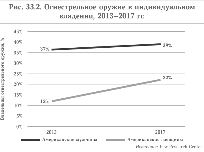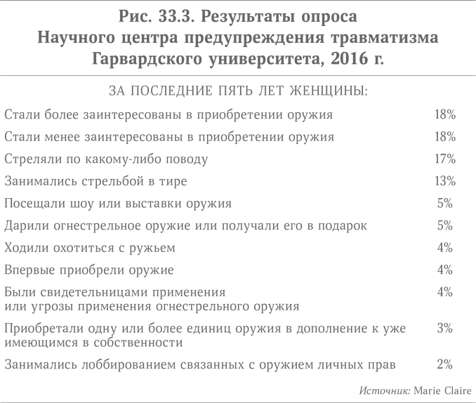Получить достоверные данные о количестве владельцев огнестрельного оружия непросто, поскольку оно может находиться в совместном пользовании членов семьи. В результате трудно выяснить и точное число имеющих огнестрельное оружие женщин. В последние десять лет два исследования показали, что оружие в личной собственности есть у 12 % женщин. В 2017 г., по данным исследовательского центра Pew Research, их доля составляла 22 %. А в конце 2015-го в опросе Harris Poll появилась цифра 18 %. Но хотя цифры плавают, многие исследования говорят о том, что число владелиц оружия растет. Производители оружия обратили на это внимание и сначала принялись выпускать разноцветные пистолеты. Оказалось, однако, что розовый пистолет – совсем не то, что нужно: женщины предпочитают оружие в стиле милитари, и для них намного важнее форма пистолета и то, как он лежит в руке, чем его цвет.