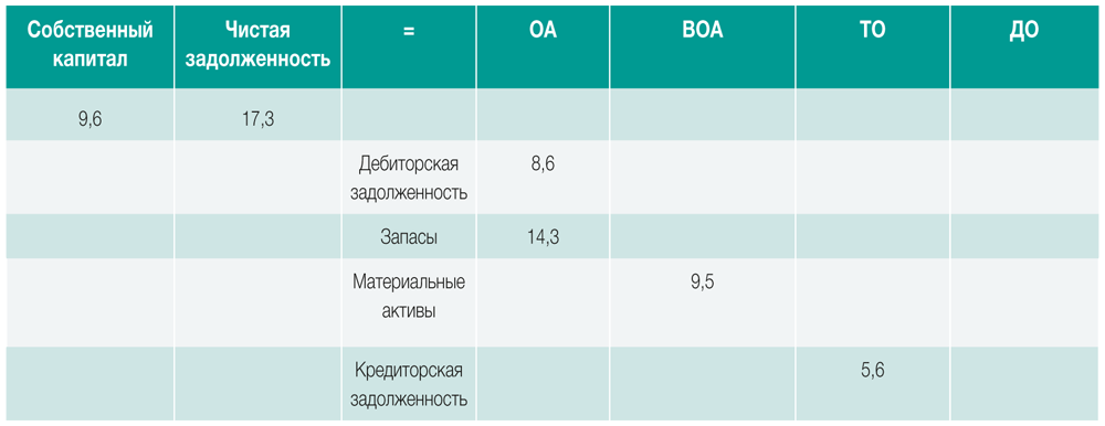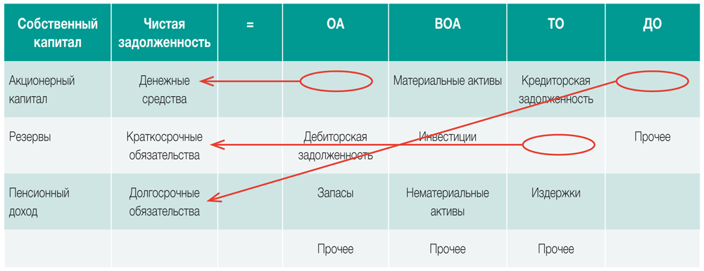 Собственный капитал + Чистая задолженность = Оборотный капитал + Прочий капитал (где Оборотный капитал = Дебиторская задолженность + Запасы [или Незавершенная работа] – Кредиторская задолженность)