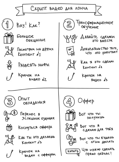 Изначально пользователей подогревали опросами, информацией о том, что команда уехала в США и изучает опыт западных предпринимателей. Затем людей собирали на бесплатный курс: непосредственно четыре видео по структуре Джефа.