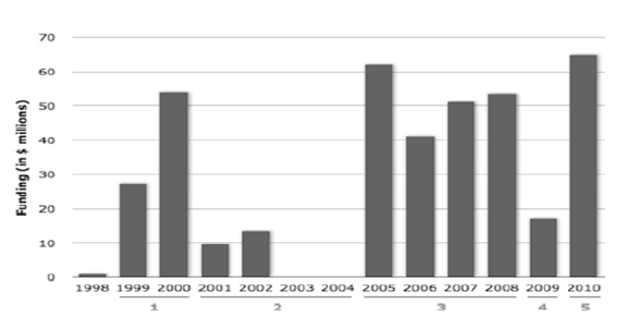Рис. 5.1. Динамика венчурных инвестиций в рынок ПО для автоматизации маркетинговой деятельности в 1998–2010 гг.[129]