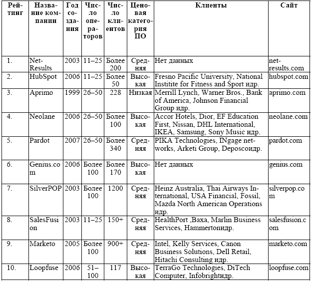 К настоящему времени сформировался рейтинг лидирующих поставщиков ПО для автоматизации маркетинговой деятельности. Согласно топ-листу портала Topseos.com по состоянию на февраль 2012 года, к числу лучших программных решений для автоматизации маркетинговой деятельности относятся компании Net-Results, HubSpot, Aprimo, Neolane, Pardot, Genius, SilverPOP, SilverPOP, Marketo, Loopfuse (см. табл. 5.1).