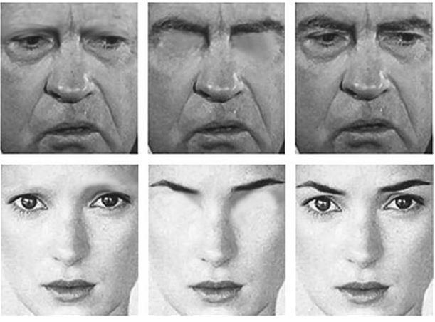 Долгое время считалось, что глаза являются самым важным элементом, помогающим распознавать лица людей. Однако исследование Садра и Джаруди с факультета исследований мозга и когнитивных наук Массачусетского технологического института [257] показало, что критическую роль в распознавании лиц людей играют не глаза, а брови. Обратите внимание на рис. 8.32: на первой фотографии лица представлены без бровей, поэтому на ней сложно узнать президента Никсона и Вайнону Райдер, в отличие от второй фотографии, где лица показаны без глаз.