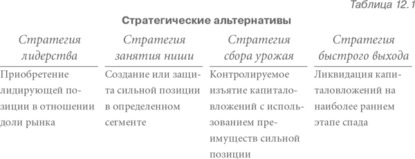 Стратегия в период спада, как правило, сосредоточена на альтернативах выхода из бизнеса или сбора урожая. Однако существует определенный выбор стратегий, хотя и не все они осуществимы в условиях конкретной отрасли. Спектр возможных стратегий может быть выражен в виде четырех базовых подходов к конкуренции, осуществляемых независимо друг от друга или в некоторых случаях последовательно (табл. 12.1). На практике различия между этими вариантами стратегии не всегда четки, однако их цели и инвестиционные последствия существенно различаются, поэтому целесообразно их рассматривать по отдельности. Классической целью стратегий в период спада, в том числе стратегий ликвидации бизнеса и сбора урожая, является изъятие капиталовложений. В то же время, проводя стратегии лидерства и занятия ниши, фирма может фактически инвестировать в укрепление позиции.