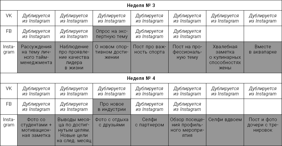 Для упрощения работы в социальных медиа стоит составить контент-план. Проще всего сформулировать такой документ в таблице Excel. Вам необходимо по вертикали выписать все социальные медиа, где находятся ваши целевые аудитории – например, «ВКонтакте», Facebook, Instagram, YouTube и Telegram, а по горизонтали – все дни недели.