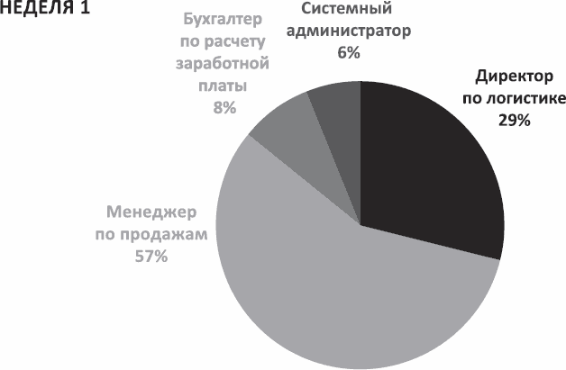 Приоритетными вакансиями в данном случае будут директор по логистике и менеджер по продажам. Причем приоритетными в равной степени: важно оперативно закрыть и ту и другую вакансию. Над оставшимися двумя вакансиями, безусловно, тоже нужно работать, но работа над приоритетными вакансиями должна вестись гораздо более интенсивно. Если взять стандартный рабочий день продуктивного рекрутера, мы можем рассчитывать на семь собеседований в день. Из этих семи собеседований четыре должны приходиться на вакансию «менеджер по продажам», два – на директора по логистике и оставшееся собеседование – на одну из второстепенных вакансий. Таким образом, за неделю (пять рабочих дней) рекрутер рассмотрит 20 менеджеров по продажам, 10 директоров по логистике, 3 бухгалтеров и 2 системных администраторов. Скорее всего, вакансия «менеджер по продажам» успешно закроется, по вакансии «директор по логистике» определится хотя бы один финальный кандидат для представления руководству компании, а второстепенные вакансии перейдут на следующую неделю. На следующей неделе рекрутер в связи с закрытием вакансии «менеджер по продажам» высвободит больше временных ресурсов. Теперь его рабочий день будет выглядеть так: три директора по логистике (большое количество собеседований в день на топ-позиции проводить не рекомендуется: во-первых, собеседование с управленцем высокого уровня требует больших временных затрат, во-вторых, количество резюме на подобные вакансии ограничено, и обеспечить большую динамику собеседований скорее всего не получится) и по два собеседования на второстепенные вакансии. За пять рабочих дней рекрутер сможет пообщаться с 15 кандидатами на вакансию «директор по логистике», 10 кандидатами на вакансию «бухгалтер» и 10 – на вакансию «системный администратор». При такой динамике скорее всего второстепенные вакансии закроются, и рекрутер сможет бросить все силы на работу над вакансией «директор по логистике». Динамика собеседований по рассматриваемым нами вакансиям приведена на рисунке ниже.
