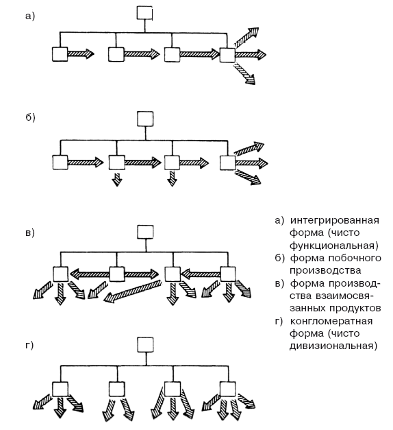 Исходный пункт – крупная корпорация, которая выпускает все свои продукты в рамках одной производственной цепочки и потому относится к интегрированной форме – чистой функциональной структуре, механистической бюрократии либо адхократии. Когда корпорация начинает продавать на рынке некоторые промежуточные продукты своих производственных процессов, она тем самым делает первый шаг к дивизионализации, к так называемому производству побочных продуктов. Двигаясь далее в этом направлении, до того момента, когда побочный продукт становится важнее основного, который все же остается центром товарно-рыночной стратегии, структура приближается к дивизиональной, превращаясь в структуру производства взаимосвязанных продуктов. Наконец, полный разрыв производственной цепочки, вплоть до потери всякой связи между выпускаемыми товарами, приводит корпорацию к конгломератной форме, чистой дивизиональной структуре. Какие-то корпорации могут проходить все эти стадии последовательно, другие останавливаются на одной из них в связи с наличием высокозатратной технической системы (обычно в случае интегрированной формы), зависимости от одного вида сырья (в случае производства побочных продуктов) или концентрации на одной основной технологии или рыночной тематике (в случае производства взаимосвязанных продуктов).