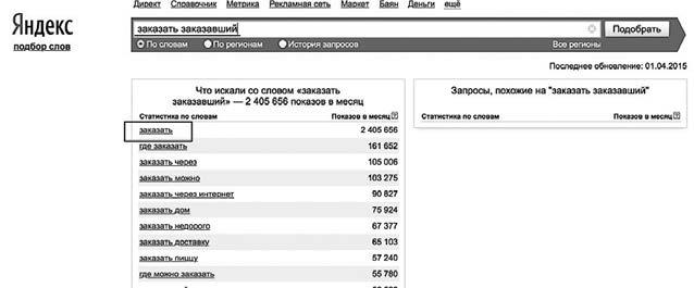 Каждый столбец нужно заполнить по максимуму. Учитывай, что Яндекс различает три части речи: существительное, глагол, прилагательное. Наречие он относит к прилагательным, причастия и деепричастия – к глаголам. «Заказ», «заказать» и «заказной» – это три разных слова. «Заказать», «заказавший», «заказывая» – с точки зрения Яндекса одно и то же. Самые популярные формы слова, которые нам не подходят, сразу можно относить в список минус-слов с фиксацией словоформы (-!купил – !купила – !купили). Если сомневаешься, являются ли два слова одним или разными для Яндекса, – проверить очень просто: введи оба в Вордстате одновременно («заказ заказной»). Если слова одинаковые, то в каждом ключевике будет содержаться только одно из них, если разные – то оба. И скорее всего выдача будет очень маленькой. Это происходит потому, что, если ввести два одинаковых слова, Яндекс воспримет только одно из них.
