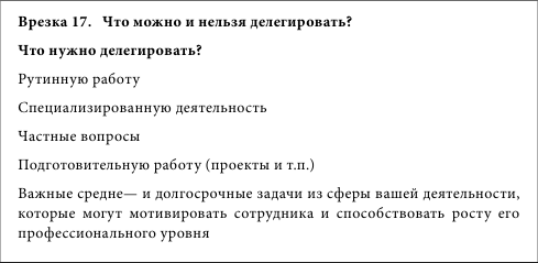 Умение делегировать особенно нужно в тех случаях, когда менеджеру надо раздвоиться и расстроиться. Например, одновременно быть у собственного ключевого клиента, контролировать точку продаж в Марьино и договариваться об открытии точки в торговом центре на Ярославском шоссе. Делегирование позволяет менеджеру сосредоточиться на личном развитии и стратегических проектах группы.