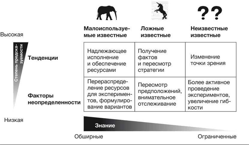 Чтобы понять значимость перемен, компании должны лучше осознавать, что они на самом деле знают, и раскрыть свои скрытые предположения. В условиях изменчивой среды эта информационная карта может постоянно меняться. В некоторых случаях компании недостаточно используют новую доступную им информацию – это, так сказать, малоиспользуемые известные, или «слоны». Также есть немало вещей, которые ошибочно кажутся известными – ложные известные, или «единороги», вероятно, их нужно пересмотреть. А самая большая сложность состоит в том, что что-то на данный момент невозможно узнать, если не посмотреть на ситуацию под новым углом или если не провести дополнительные эксперименты, – это двойной вопрос, или, по выражению бывшего министра обороны США Дональда Рамсфелда, «неизвестное неизвестное» (рисунок 3–5)[75].