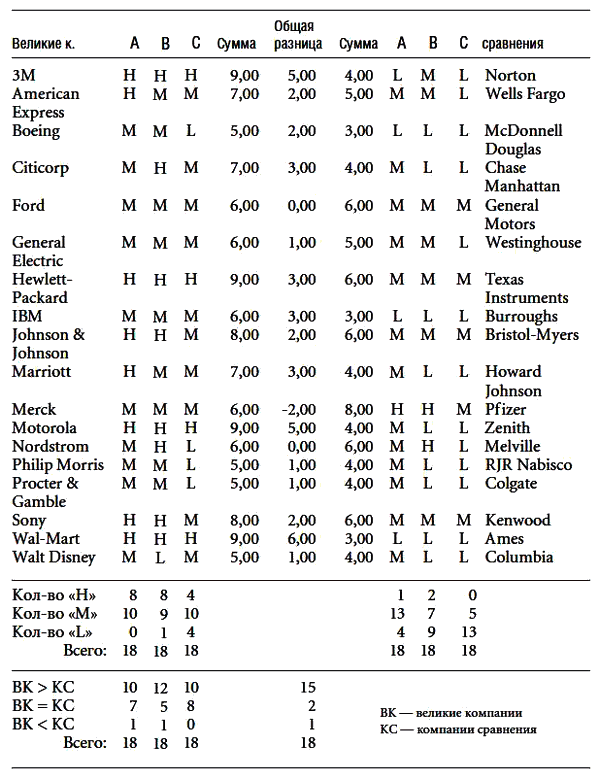 Основываясь на всех имеющихся у нас фактах деятельности компаний, мы дали им всем оценку по каждой категории. Затем путем суммирования была получена итоговая оценка для каждой компании, при этом отметка «H» расценивалась в 3 балла, «M» — в 2 балла, «L» — в 1 балл.