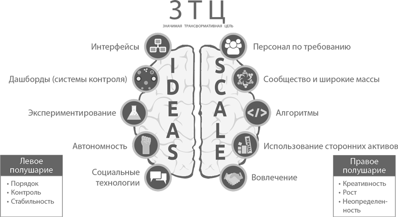 В этой главе мы рассмотрим феномен Значимой трансформативной цели и пять внешних атрибутов ЭксО, составляющих аббревиатуру SCALE. В следующей главе мы изучим пять внутренних атрибутов, образующих аббревиатуру IDEAS. Сравнение с двумя полушариями головного мозга помогает наглядно представить структуру десяти ключевых признаков ЭксО. Правое полушарие управляет ростом, креативностью и неопределенностью, левое отвечает за порядок, контроль и стабильность.