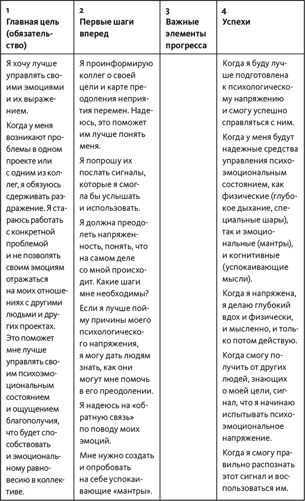 Первый шаг вперед Кэти сделала, когда оповестила коллег о своей главной цели и разрешила им информировать ее о тех моментах, когда, по их мнению, она вела себя слишком эмоционально. Она не могла даже ожидать, что через неделю вооружит коллег данными, которые им понадобятся для того, чтобы «сигнализировать» Кэти о том, что она напряжена сверх меры.