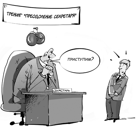 Можно импровизировать до бесконечности. У секретаря складывается впечатление, что вы свой парень. Если же вас все-таки спрашивают: «А что вы хотели?» или «А по какому вопросу?» – вы должны задействовать универсальный метод (имя, фамилия, «Да он в курсе!»).
