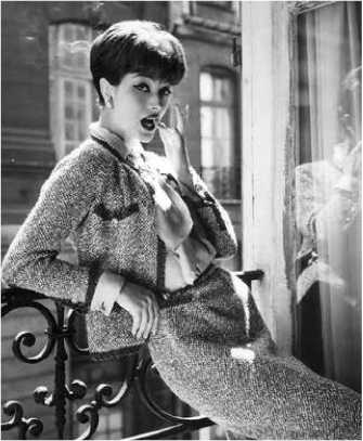 В 1956 году Шанель представила костюм-двойку из твида без воротника с отделкой из тесьмы