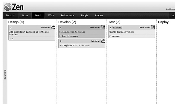 В настоящий момент на рынке появляются веб-сервисы и приложения для электронной визуализации. Они используют визуальные панели, которые симулируют стены карточек с их столбцами, ограничениями числа рабочих задач и другими сущностными характеристиками Канбана. Среди них есть (список, конечно, неполон) Lean Kit Kanban, Agile Zen, Target Process, Silver Catalyst, RadTrack, Kanbanery, VersionOne, Greenhopper for Jira, Flow.io и некоторые другие надстройки с открытым кодом, которые добавляют интерфейс Канбана к таким инструментам, как Team Foundation Server и FogBugz. Рис. 6.7 демонстрирует пример из AgileZen.