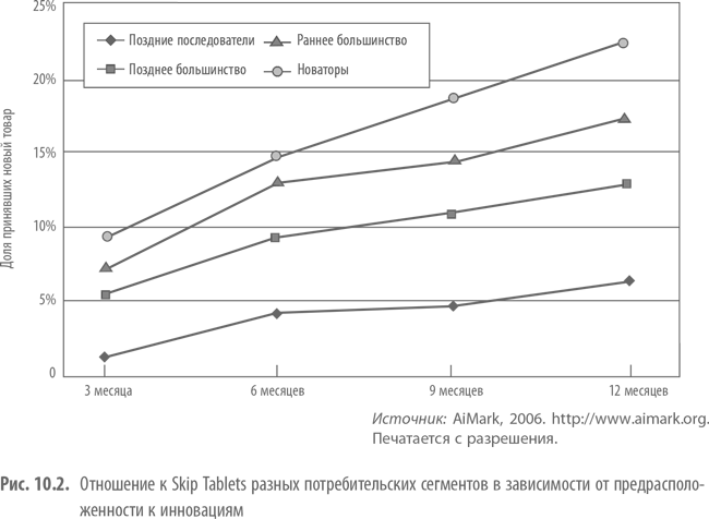 Заметьте, что эта схема сегментации в высшей степени практична, потому что предрасположенность потребителя к инновациям можно оценить предварительно, так как это черта характера, которая не зависит от конкретных инноваций. Таким образом, можно классифицировать потребителей в зависимости от показателей их предрасположенности к инновациям еще до выхода продукта на рынок. Это позволяет компании разрабатывать целенаправленные стратегии заранее, а не в течение нескольких месяцев после выхода нового товара на рынок, так как именно данный период имеет решающее значение для успеха нового товара.
