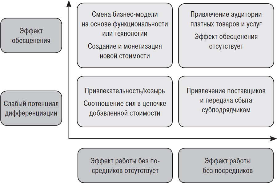 Наиболее типичными представителями обесцененных отраслей являются телефон, почта, услуги связи, газетно-журнальная промышленность и т. д. В этом случае технология позволяет исполнять некоторую функцию, например функцию коммуникации, с меньшими затратами труда. Таким образом, разрушению подвергается непосредственно стоимость. Значит, изменилась бизнес-модель. Отсюда: две возможные стратегии: