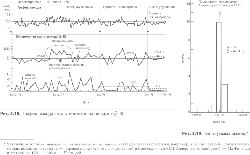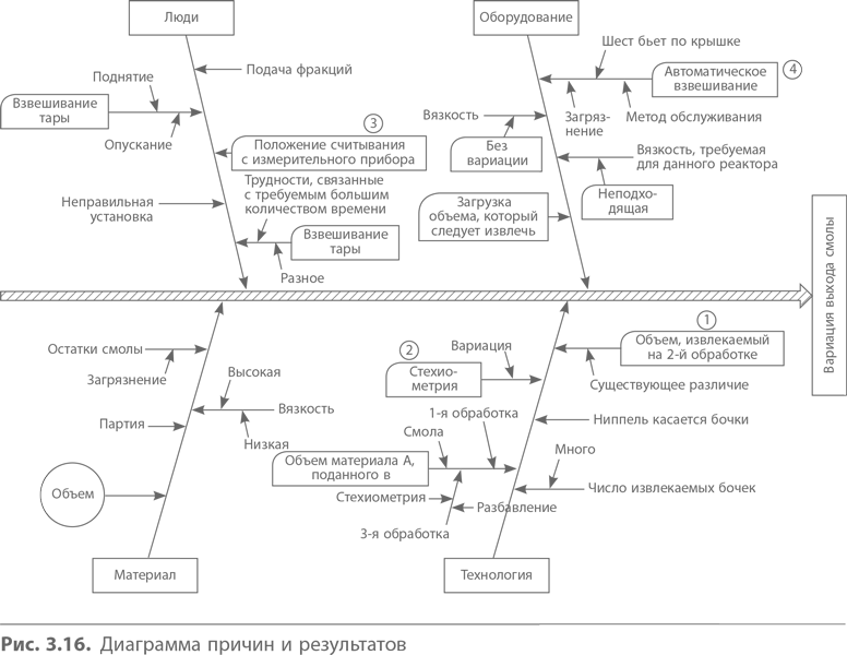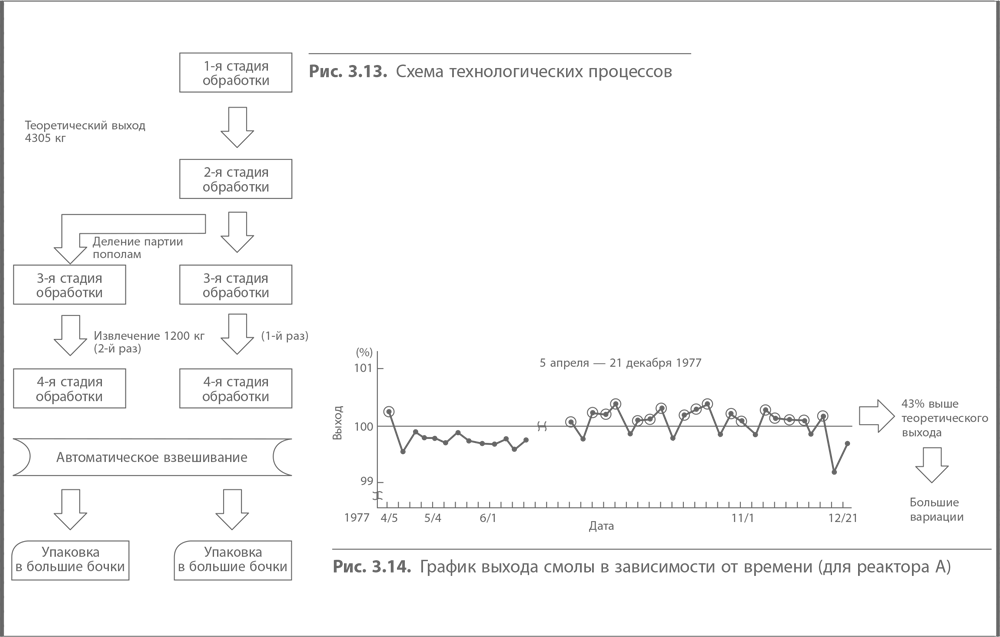 1. Выбор темы. Как показано на рис. 3.13, после второго этапа обработки партия сырья делится пополам, и каждая часть проходит третью и четвертую стадии обработки отдельно. Средний выход составлял 99,8 %, но, как видно на рис. 3.14, его вариабельность была велика и в 43 % случаев превышала теоретическое значение. Поскольку стабильность выхода непосредственно влияет на качество смолы, кружок поставил вопрос о том, как снизить вариацию. (Примечание: технические термины: абсолютный выход = количество производимого вещества; относительный выход или просто выход = отношение произведенного количества к теоретическому выходу.)