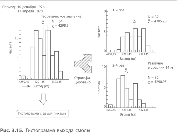 2. Осмысление ситуации. На основе имеющихся данных была построена гистограмма (показана на рис. 3.15). Поскольку график имел два пика, члены кружка пришли к выводу, что это результат смешивания двух разных партий сырья, а затем еще и выяснили, что средние веса этих партий отличались на 14 кг. Более того, контрольная карта средних весов и размахов (? – R карта) показала, что вариации между партиями достигали 48 кг, что не было видно на графике выходов. Между партиями встречались и вариации, превышающие 60 кг[20].