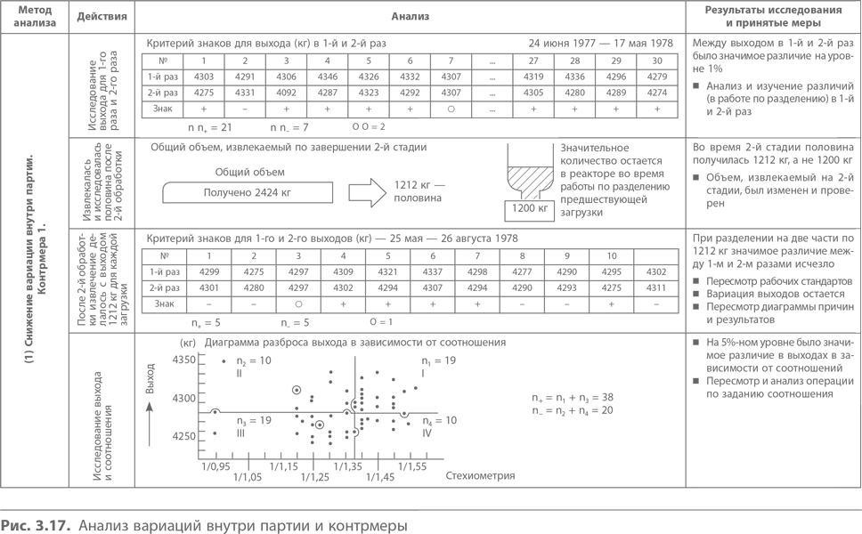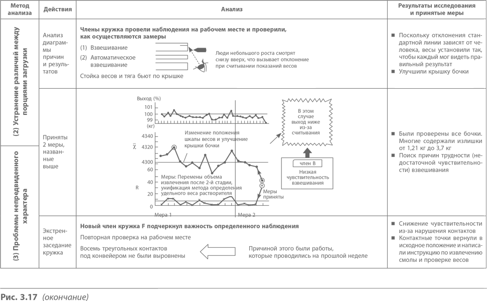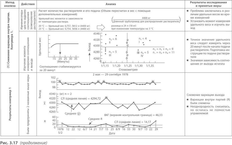 4. Факторы и меры. После снижения вариации внутри партии контрмеры были направлены на ее снижение между отдельными партиями. Из числа факторов, перечисленных на рис. 3.16, члены кружка выделили три приоритетных: работа по разделению после второй стадии, стехиометрия (соотношение компонентов) и процесс автоматического взвешивания. Далее, как показано на рис. 3.17 и 3.18, был проведен анализ и приняты меры, которые позволили кружку КК решить поставленную задачу. Неожиданные трудности возникли в связи со взвешиванием, но после непосредственного наблюдения за процессом члены кружка устранили и эти недоработки.