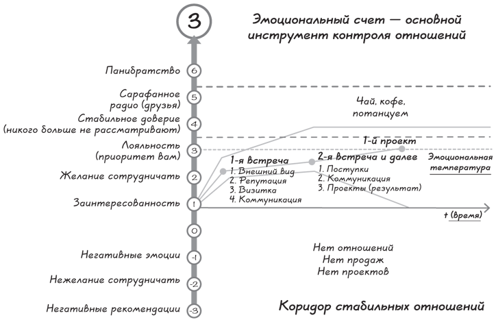 Коридор стабильных отношений – наиболее комфортная область, которой может достигнуть ваш эмоциональный счет. Это то, к чему необходимо стремиться. Находясь в нем, даже допустив оплошность, вы сможете удержать эмоциональный счет от падения и вернуть на нужный вам уровень. Высший уровень – «сарафанное радио», когда с вами не просто работают, но еще и активно рекомендуют другим клиентам.