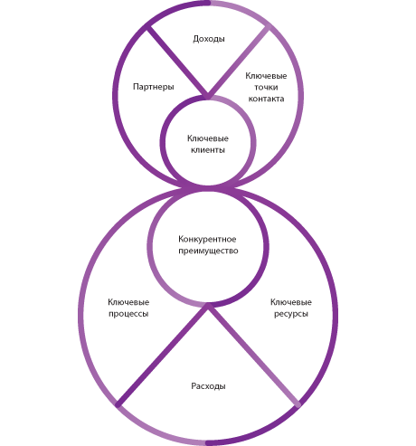 Для проработки бизнес-модели мы рекомендуем использовать созданную нами матрицу 8K-матрешка. Мы осознанно использовали эту аналогию, ведь если модель сформирована правильно, то будет наблюдаться эффект матрешки: если внимательно посмотреть на 8К-матрешку, то мы увидим две матрешки – малую и большую. Малая – это ключевые клиенты и основное конкурентное преимущество. Это сущность любой бизнес-модели. Ошибки в определении этих двух параметров ставят под угрозу всю эффективность бизнес-модели компании. Маленькая матрешка находится внутри большой, которая дает целостное, комплексное представление о бизнесе компании и показывает причинно-следственные связи между ключевыми элементами.