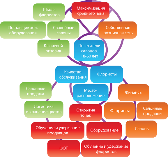 Для того чтобы показать, что даже в бизнесах, крайне ограниченных в плане расширения возможностей, вполне реально организовать работу по-другому, приведем пример. Торговля букетами цветов, как правило, очень локальна (в пределах города) и негибка с точки зрения изменения бизнес-модели. Ключевые клиенты такого бизнеса в основном покупают букеты по случаю значимых событий в жизни своих близких и знакомых. Ключевая точка контакта – собственная сеть салонов цветов. Для эффективного ведения бизнеса здесь необходимы партнеры: школа флористов, свадебные салоны, ключевой поставщик цветов, поставщик холодильного оборудования. Как правило, доходы формируются за счет максимизации стоимости букета. В числе конкурентных преимуществ можно назвать месторасположение салона, профессионализм сотрудников, качество обслуживания. Ключевые процессы – непосредственно салонные продажи, логистика и хранение цветов. К ключевым ресурсам мы отнесем финансы, необходимые для поддержания оборотного капитала, а также флориста, продавцов (их, как правило, тяжело найти и сколько-нибудь долго сохранить) и помещения. Основные расходы – покупка оборудования, открытие новых точек (доходность этого бизнеса очень зависит от количества салонов в сети), обучение и удержание продавцов и флористов, фонд оплаты труда.