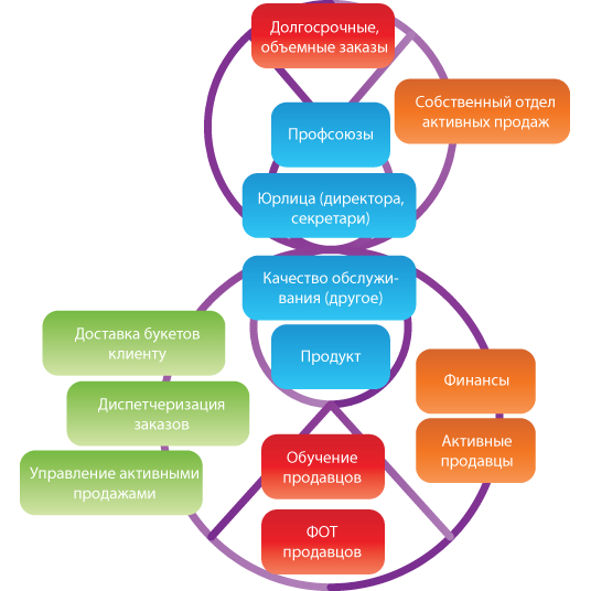 В данном случае акцент сделан на продаже подарочных букетов компаниям активным отделом продаж. Задача продавцов – реализовать годовую подписку на услуги по доставке букетов к необходимой дате.