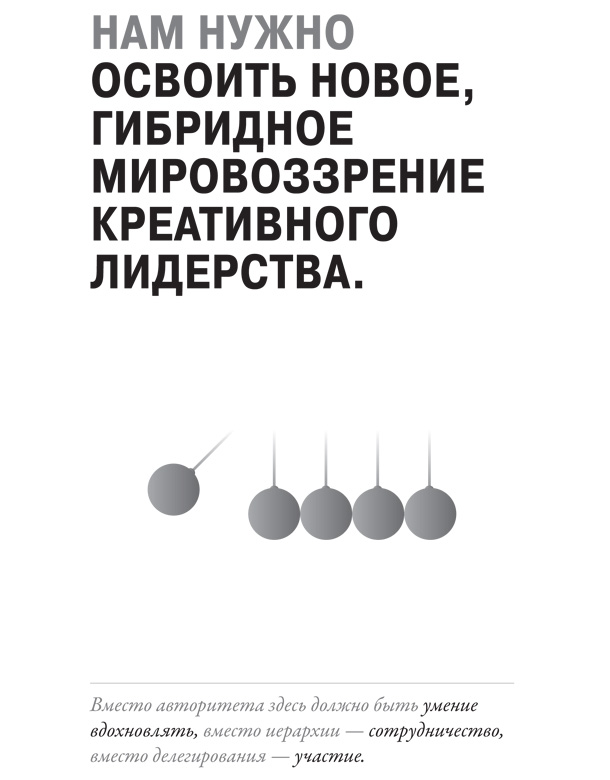 До сих пор в нашей образовательной системе очень многое зависит от способности логично обосновывать что-либо от причины до результата. Но результаты появляются под воздействием нескольких причин. Сегодня мир устроен гораздо более сложно, чем раньше. Многие люди спешно описывают прошлое и управляют настоящим, но те, кто мыслит креативно, кого часто называют бунтарями и неудачниками, отлично рассказывают, как будет выглядеть мир, просто задавая вопрос: а что если? Этот подход в мышлении ставит под сомнение саму идею образования, в особенности обучение руководящих сотрудников. Это подразумевает, что выпускники MBA (магистры делового администрирования) теперь не только «люди с высоким потенциалом». Если рассмотреть эволюцию основных навыков, которые требовались для того, чтобы руководить компанией по производству потребительских товаров, то мы увидим следующее: сначала были инженеры, которые изобрели или хотя бы действительно поняли, как устроен продукт компании; далее, когда процесс заключения контрактов усложнился, появились адвокаты; теперь есть еще дипломированные мастера бизнес-администрирования и магистры финансового менеджмента, которые разбираются в балансовых отчетах, декларациях о доходах, прибылях и убытках, поскольку современным компаниям нужно постоянно обосновывать свою финансовую деятельность. Это очень важно, но это означает управление статус-кво. Поскольку будущий успех зависит от умения находить решения и создавать возможности, нам всем нужно освоить новое, гибридное мировоззрение креативного лидерства. В чем его разница с тем, как учат думать на курсах MBA? Вместо авторитета здесь должно быть умение вдохновлять, вместо иерархии – сотрудничество, вместо делегирования – участие. Одержимость тем, чтобы избегать ошибок, превращается в одержимость инновациями и тем, как учиться на ошибках.