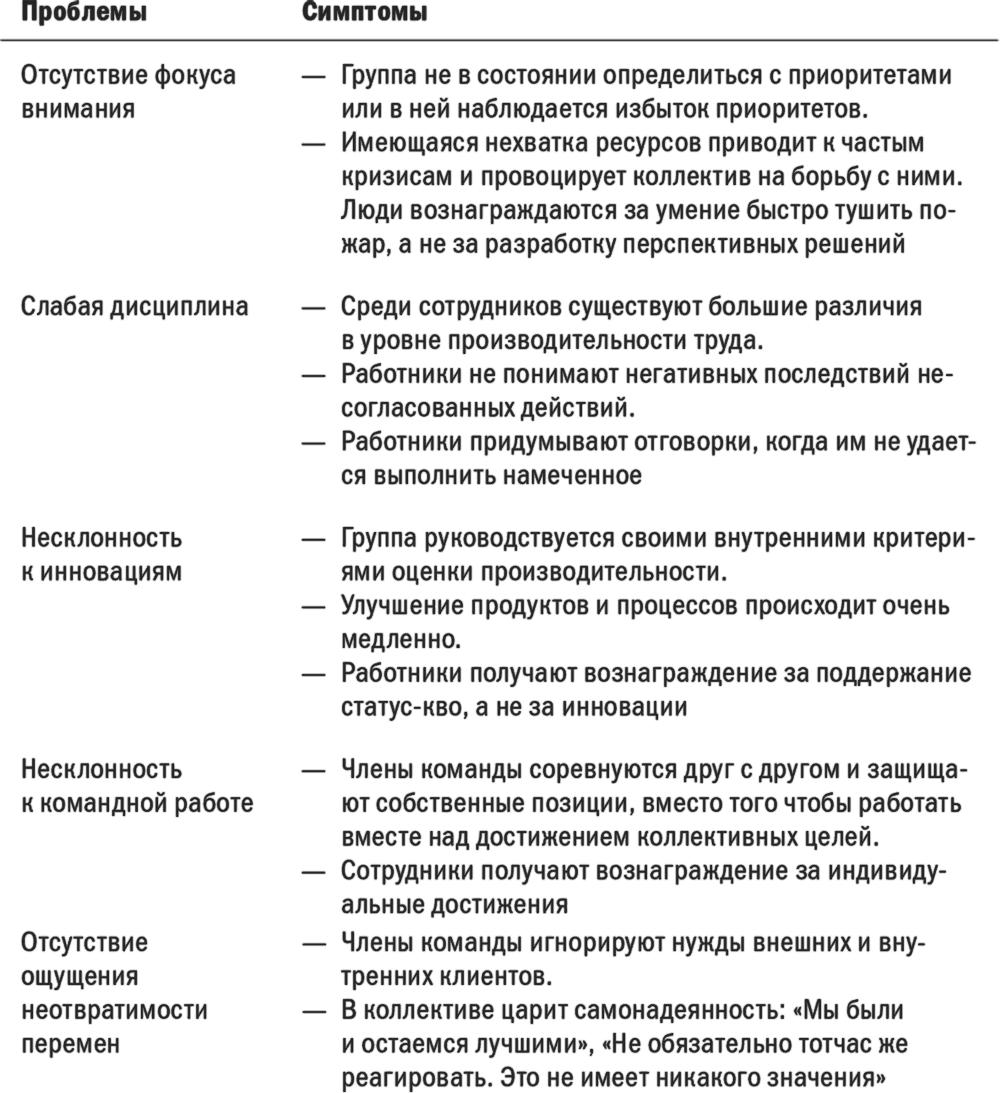 Начните с определения того, какие черты поведения вы считаете неприемлемыми. Например, для Элен Ли было важно избавить сотрудников от чувства страха, пробудить в них инициативу. И вы составьте четкое представление о том, какого поведения сотрудников вы ожидаете, как ваши действия по достижению первых побед будут способствовать переменам. Какое поведение ваших работников снижает потенциал организации, сказывается на производительности? Взгляните на табл. 4.1, в которой перечисляются некоторые из распространенных проблемных моделей поведения, и сделайте выводы о том, какие из них присущи вашей организации и какие вам хотелось бы изменить.