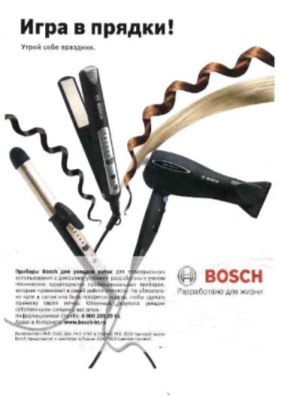 Что касается рекламного послания, то наличие его в рекламном тексте помогает целевой аудитории эксплицировать авторскую интенцию, которую в данном тексте можно выразить следующим образом: приборы для укладки волос фирмы Bosch помогут без труда сделать отличную прическу в домашних условиях, причем утомительный процесс превратится в увлекательную игру, а удовольствие и от процесса, и от результата может сравниться только с удовольствием от настоящего праздника. Таким образом, грамотное включение компонентов разных семиотических систем в единую текстовую структуру рекламного сообщения 1 позволит реципиенту запомнить этот текст и, в идеале, при подходящих обстоятельствах извлечь из памяти нужную информацию.