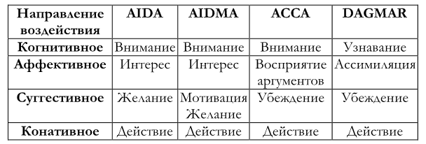 Первыми моделями анализа рекламного воздействия стали иерархические модели. По своей концепции все они представляют собой упорядоченную последовательность каких-либо потребительских реакций. Общий принцип построения такой последовательности стабилен: входящая информация (реклама) – ряд промежуточных эффектов – покупка. Причем каждая последующая реакция является как бы «вложенной» по отношению к предыдущей, т.е. предполагается, что следующая в иерархии потребительская реакция наступает только после реализации предыдущей. В обобщенном виде эти ставшие уже классическим модели Е. Ромат представил в следующем виде (см. Таблица 1):