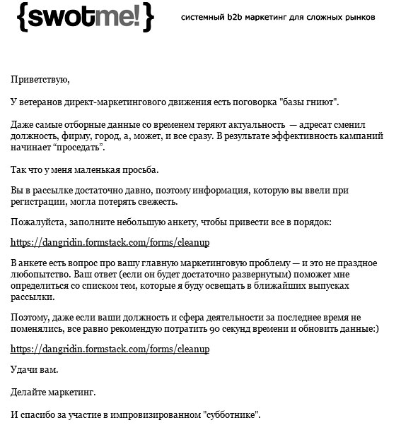 Одним из способов проверки может стать актуализация контактных сведений. Отправьте вашим адресатам письмо с темой «Проверка сведений», а в тексте задайте прямые вопросы об интересах и контактах вашего адресата. Напишите, что исключите из рассылки тех, кто не ответит на письмо, чтобы «не портить карму». Если ваша база небольшая, вы всегда можете сделать звонок для проверки контактных данных.