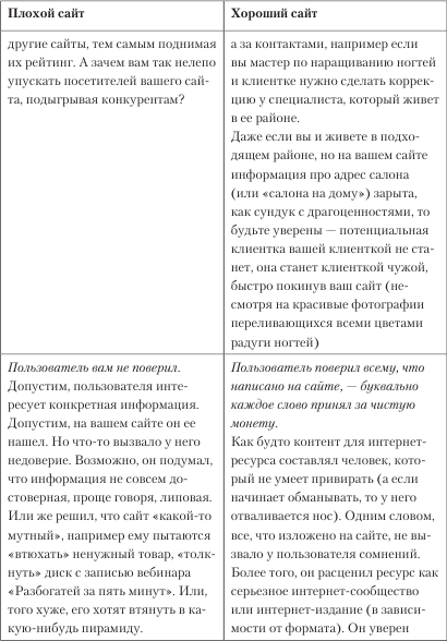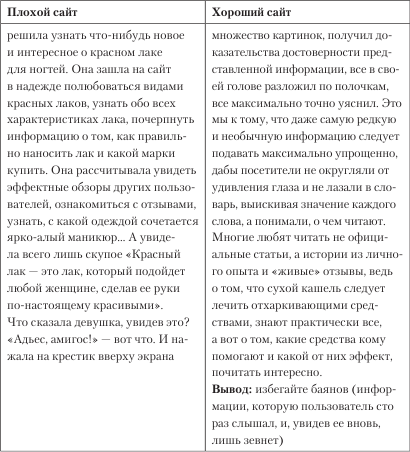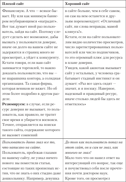Рассмотрим таблицу. В правой колонке представлены характеристики хорошего (назовем его так) сайта, а в левой – плохого. Разумеется, мы обсуждаем способность сайтов удержать посетителя как можно дольше и подтолкнуть к просмотру как можно большего количества страниц.