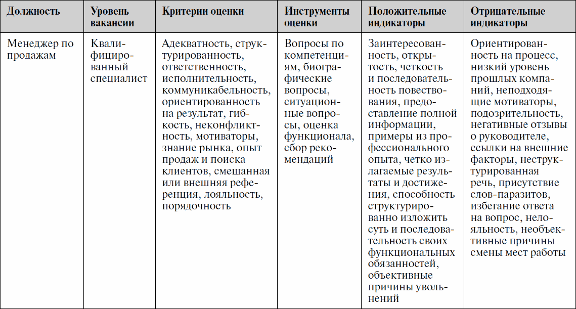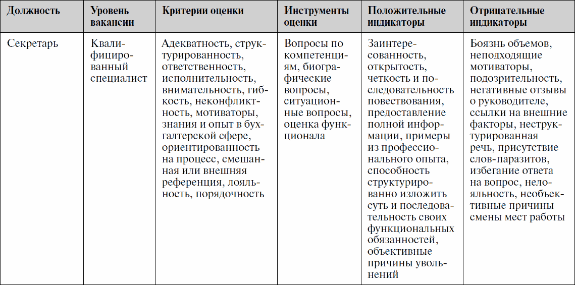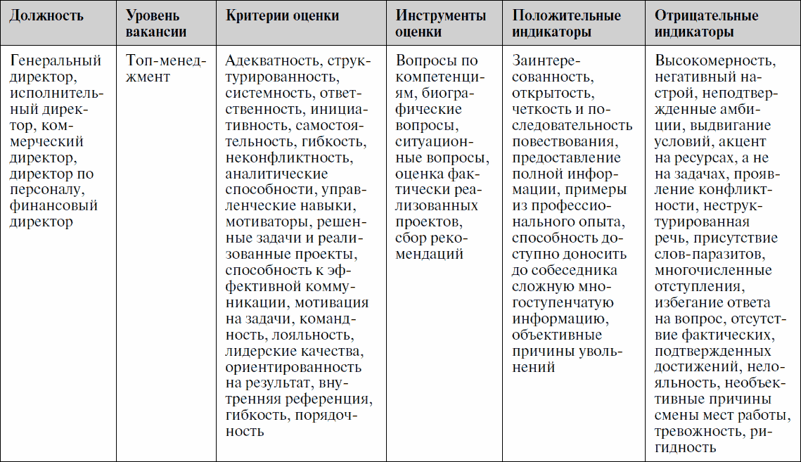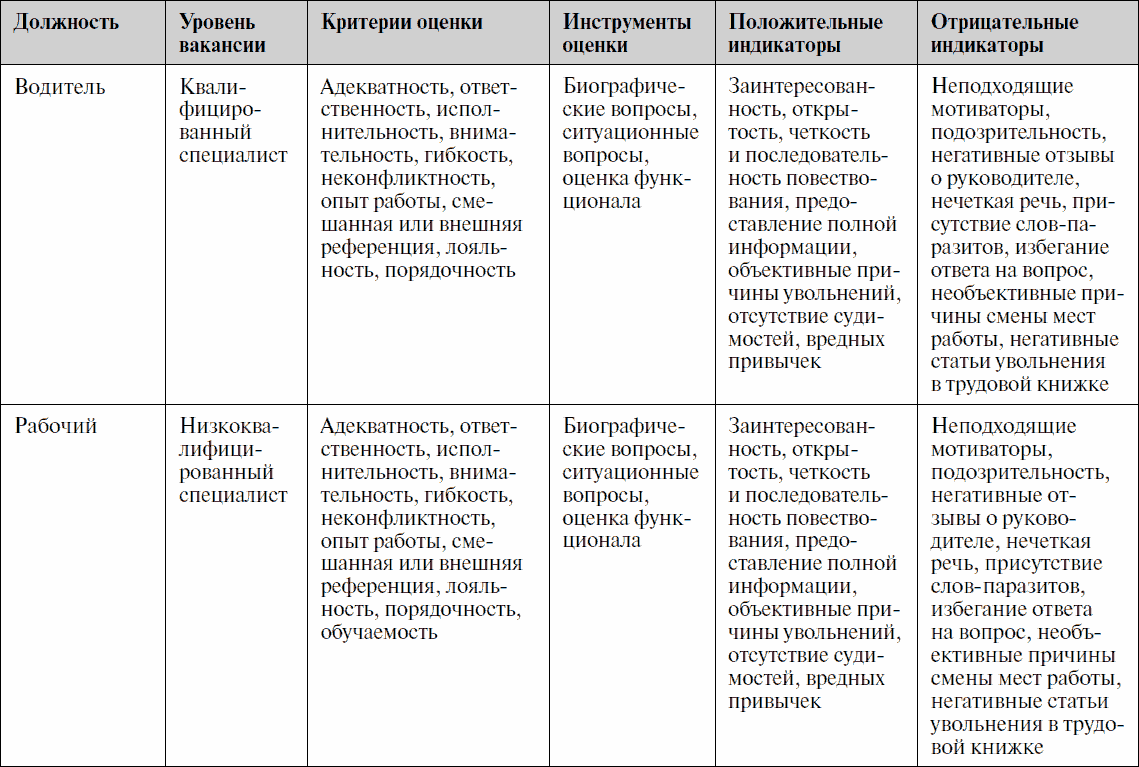 Массовый подбор существенно отличается от подбора топ-менеджеров: используется совершенно другая стратегия, существенно отличаются оценочные инструменты, а также формат и временные рамки собеседования. От уровня вакансии зависит многое. Если Вы ищете неквалифицированный персонал, Вам будет достаточно оценить адекватность кандидатов; если вакансия подразумевает определенный уровень квалификации, набор параметров, которые нужно оценить, увеличивается. В таблице ниже представлен инструментарий рекрутера, который необходим для качественной оценки нанимаемого персонала применительно к различному уровню должностей. Данная таблица послужит Вам ориентиром: что и как следует оценивать у того или иного специалиста.