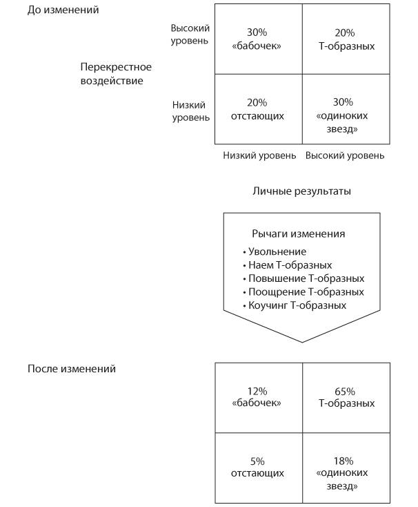 Результаты всех этих действий в совокупности могут быть невероятными. Я как-то проводил реалистичную симуляцию, основанную на начальной позиции в рис. 5.4. Предполагалось, что вы увольняете 10 «отстающих» в год в течение трех лет, а текучка кадров в вашей группе составляет 10 %. Ежегодно можно превращать в Т-образных 10 % оставшихся сотрудников группы (подробнее см. примечания[194]). Результаты показаны в нижней части рис. 5.4. Если сначала в группе было лишь 20 % менеджеров с Т-образным поведением, то после изменений их стало 65 %. Это огромная разница.