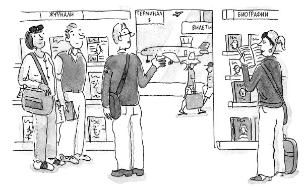 (Джон, листая журналы в магазине в аэропорту, замечает своего бывшего коллегу с женой.)