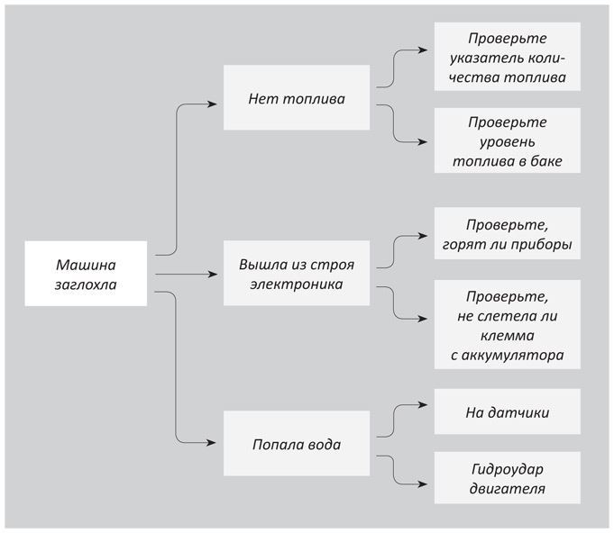 Постараемся определить причины проблемы. Используя правило MECE, выясним, по каким причинам вообще может заглохнуть машина. А затем, исключая гипотезы, попробуем найти реальную причину, которую мы можем продиагностировать на дороге: кончился бензин, слетела незатянутая клемма с аккумулятора.