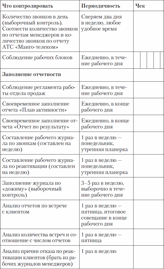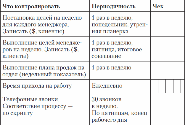 Таблица 6.5. Контрольная работа руководителя отдела продаж (из диагностики) «Недельный чек-лист “Осуществление контроля процессов в отделе активных продаж”»