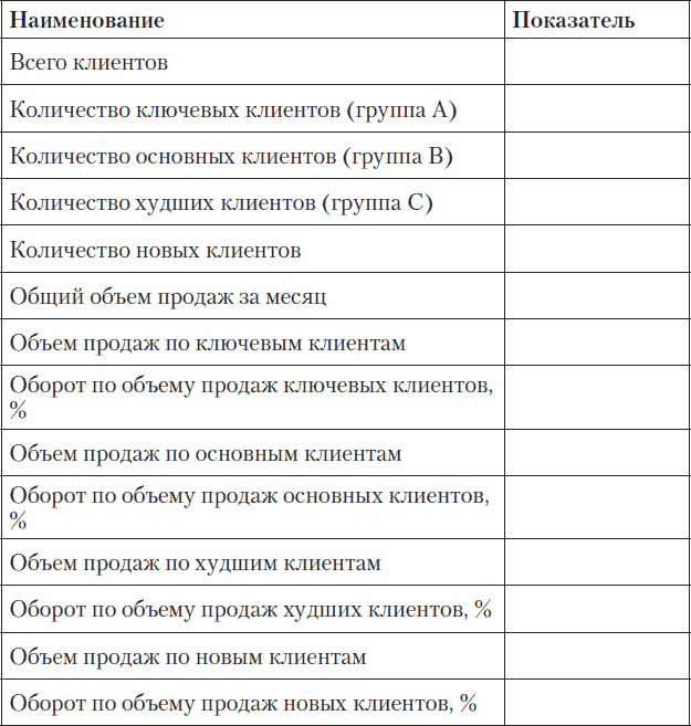 Помимо этого, руководитель ежемесячно проводит аудит клиентской базы. Форма отчета представлена в табл. 6.6.