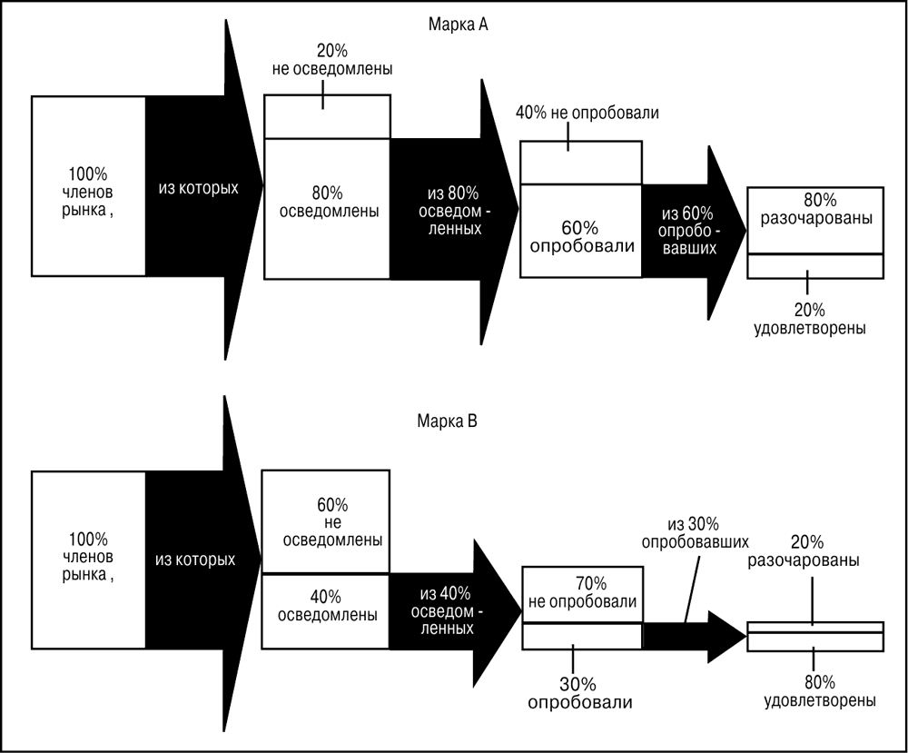 На рис. 14.3 приводится пример анализа обратной связи. Взяв марку «А», мы обнаруживаем, что о ней осведомлены 80 % членов всего рынка, 60 % уже опробовали ее, но только 20 % из числа опробовавших остались ею довольны. Это говорит о том, что программа коммуникаций эффективна с точки зрения создания осведомленности, но сам товар не оправдывает ожиданий потребителей. С другой стороны, только 40 % членов всего рынка осведомлены о марке «Б», только 30 % из них опробовали ее, зато довольными остались 80 % из числа опробовавших. В этом случае программу коммуникаций необходимо усилить, чтобы извлечь выгоду из способности товара удовлетворить потребителей.