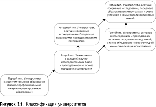В этой главе представлена классификация университетов по критерию изменения качества научных исследований и образования в процессе перехода университета к университету третьего поколения (см. рис. 3.1). Первый, второй и третий типы университетов соответствуют университетам первого, второго и третьего поколений, в то время как четвертый и пятый типы являются лучшими образцами университетов второго и третьего поколений.