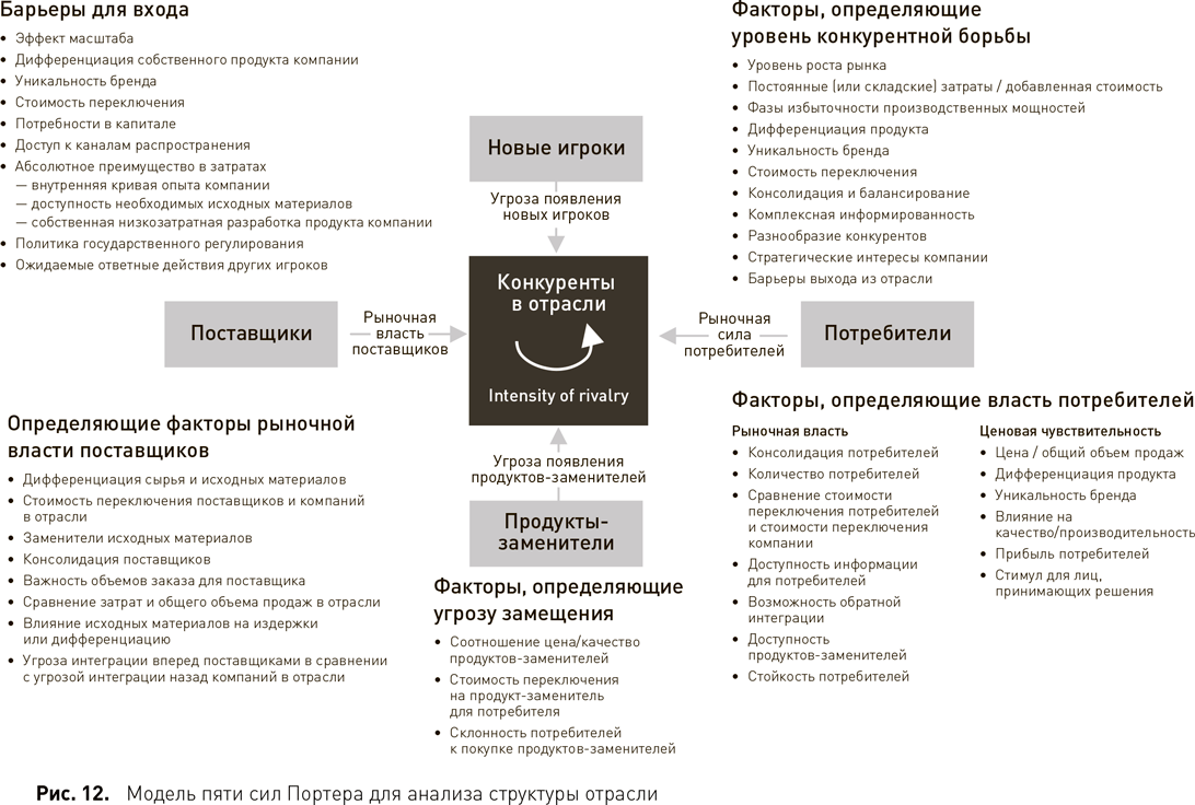 С помощью этих сил компания может прекрасно структурировать и проанализировать свою цепочку создания стоимости и внешнюю среду или потенциальный рынок. Рисунок 12[32] демонстрирует эту модель и показывает, какие ключевые определяющие факторы или критерии можно использовать для анализа и оценки интенсивности конкуренции.