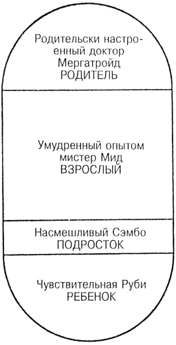 Интересно было наблюдать серию персон, представленных мистером Мидом. Вначале это был рациональный, умудренный опытом взрослый, дававший краткие объяснения принципов спиритуализма; это был сам мистер Мид. Затем появился чувствительный, послушный, невинный ребенок Руби, за которым последовал насмешливый подросток Сэмбо. Все они проложили дорогу доктору Мергатройду, главной фигуре вечера, который был «материализован» мистером Мидом в отцовской роли мудрого старого учителя, чья радость – «просвещать тех, кто ищет истину». Эти компоненты представлены на рисунке 10.